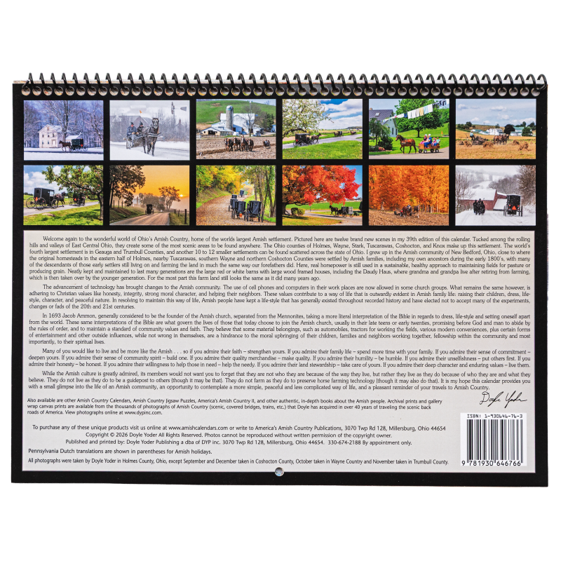 AMISH COUNTRY 2027 features twelve (9" X 12") breathtaking scenes from Holmes County, Ohio, the largest Amish settlement in the world. Internationally known photographer Doyle Yoder grew up and still resides here, surrounded by some of the most beautiful farm land to be found anywhere. Farm land originally settled by the Amish and farmed with magnificent teams of work horses, picturesque red or white barns with big wood framed farm houses, dot every homestead for miles. Valleys untouched by electric lines with dirt roads leading off around the bends and through the hills in all directions. Yards filled with gorgeous flower gardens and life lived much the same way today, as our forefathers did a century ago. Enjoy the seasons of Amish Country in some of the most awesome scenery that Amish Country has to offer as vividly depicted in the intense colors of the autumn photos. All brought to you by Holmes County’s award winning photographer, Doyle Yoder